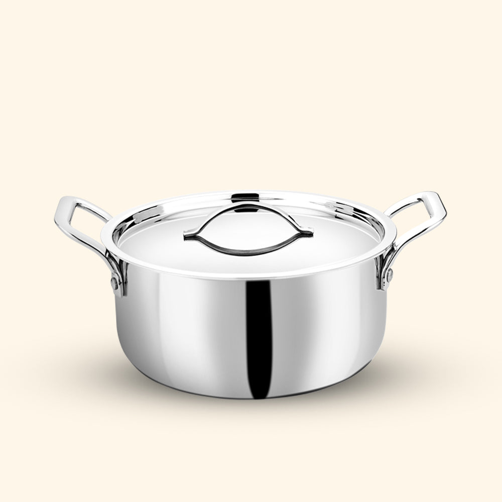 Triply cookware is relatively easy to clean. Hand wash it with mild detergent and a non-abrasive sponge or cloth. Avoid using abrasive scrubbers or harsh chemicals that can damage the stainless steel surface. Regularly polishing the stainless steel can help maintain its shine.