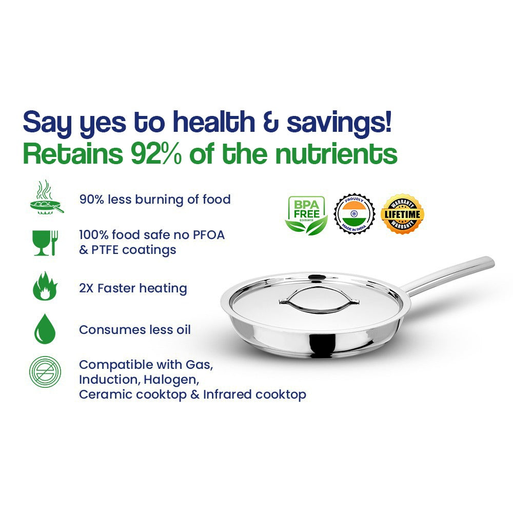- Complementary Lid: Our Triply Frypan comes with a well-fitting lid that helps to lock in the flavours and moisture for enhanced cooking results.