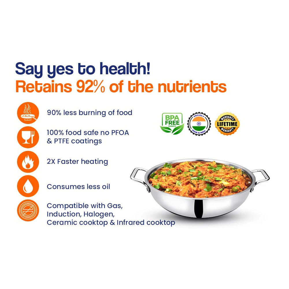 Healthy & Easy Cooking: The Triply Kadai facilitates minimal oil usage and even heat distribution which ensures healthier cooking without compromising on taste or burning/sticking of food.