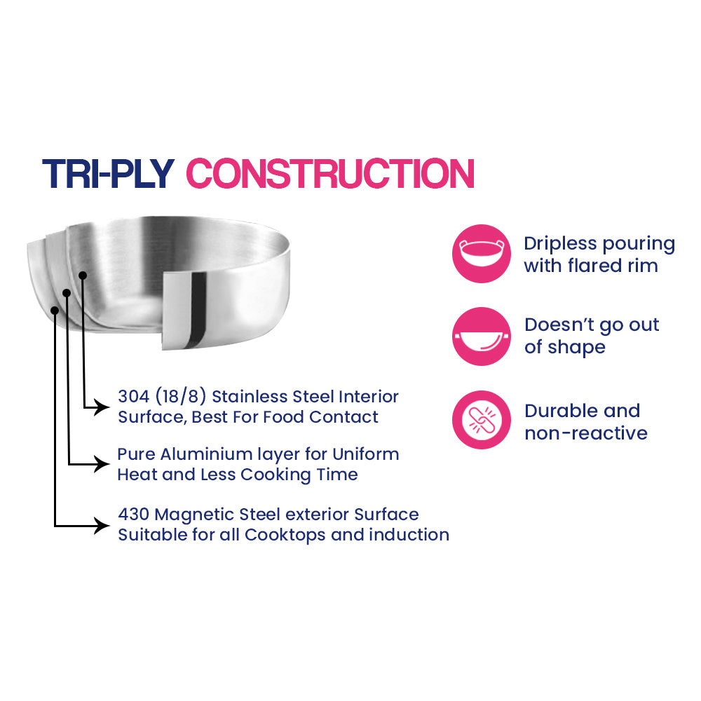 Bhalaria Stainless Steel Triply Tasla – your kitchen's versatile companion. Crafted with precision to cater to all your daily cooking desires. Here’s what makes it special: