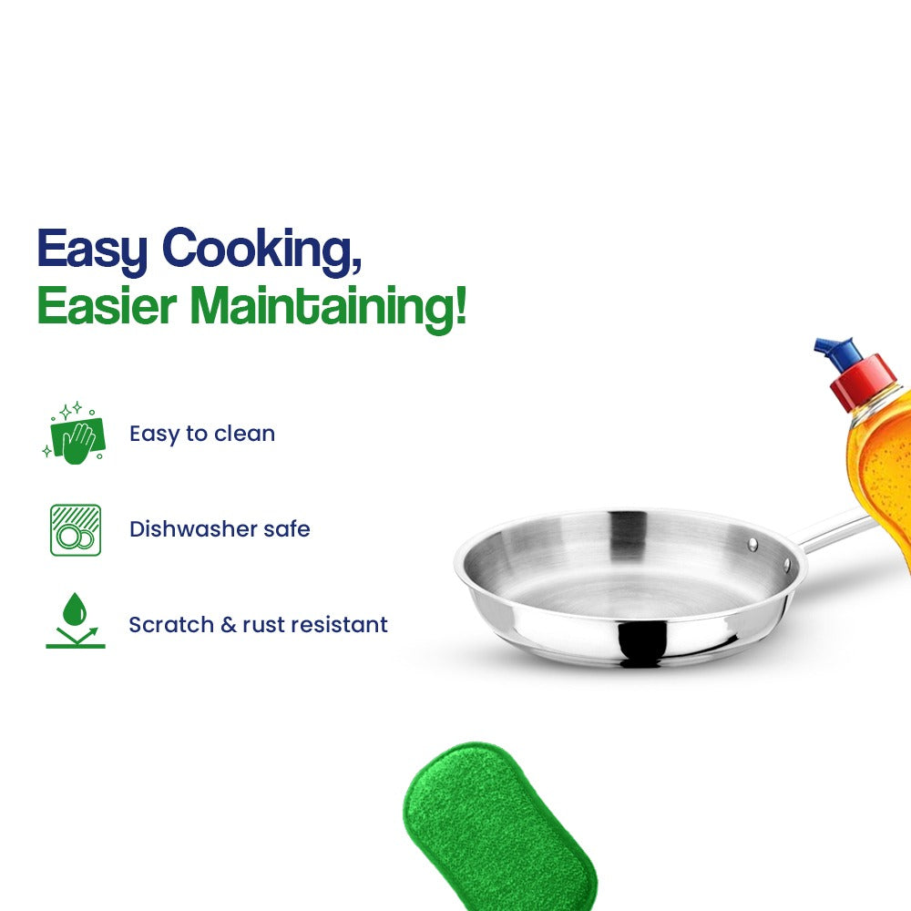 Triply cookware is relatively easy to clean. Hand wash it with mild detergent and a non-abrasive sponge or cloth. Avoid using abrasive scrubbers or harsh chemicals that can damage the stainless steel surface. Regularly polishing the stainless steel can help maintain its shine.